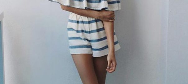 Shay Mitchell Is Flirty And Feminine In A Ruffle Striped Off-Shoulder Top
