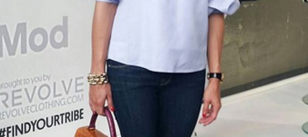 Olivia Palermo Is Oozing With Feminine Allure In A Blue Pinstriped Off-The-Shoulder Top