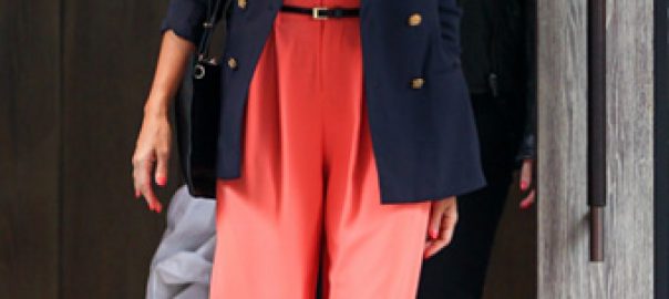 Going With The Flow: Jessica Alba Wore Trendy Coral Wide-legged Trousers Shopping In New York