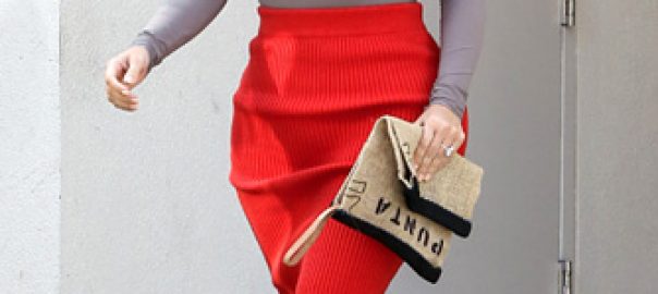 Kim Kardashian Flaunts Curves in Red Wool Skirt