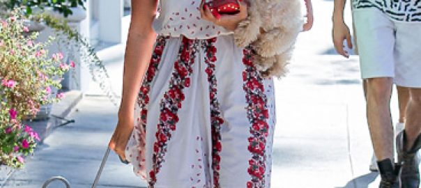 Ashley Tisdale In A Cute White and Red Floral Sundress Out With Her Dog