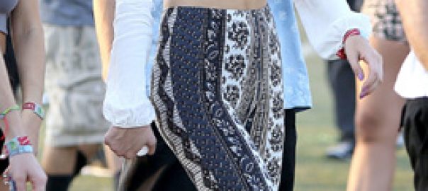 Vanessa Hudgens in red print Spell & The Gypsy Collective Desert Wanderer Playsuit with black ankle boots and fringe backpack at Coachella on April 13 ...