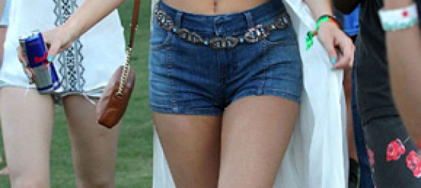 Kendall Jenner in embroidered crop top with denim shorts and brown cowboy boots at Coachella Festival on April 11 ...