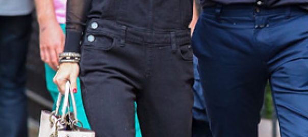 Olivia Palermo sunglasses, navy blue shirt, blue pants, overalls, white handbag, black shoes, flat shoes Johannes Huebl Out For A Stroll In New York ...