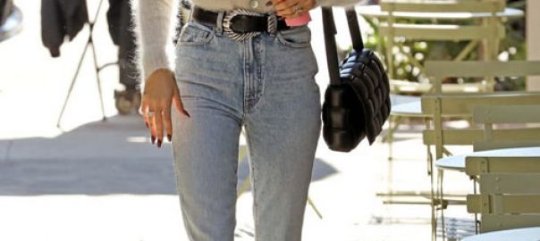 Hailey Bieber Knows the Cool Way to Wear a Cropped Sweater anderson's, bag, Belt, Bottega Veneta, Cardigan, celebrity fashion, Earrings, Fashion, Hailey Baldwin, jeans, Jennifer Fisher, khaite, Knitwear, Opening Ceremony, saint laurent, streetstyle, Sunglasses, what she wore ...