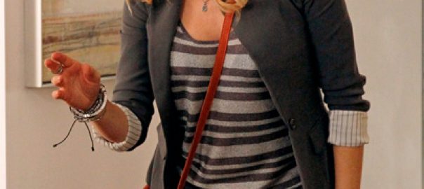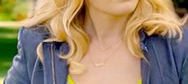 Kate’s grey tank top with yellow trim and blue leather jacket on Trophy Wife