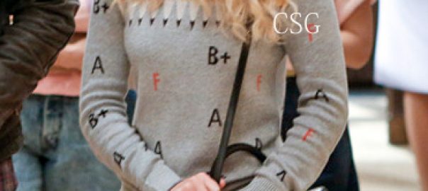 Carrie’s Grey Alphabet Sweater with Red Horse Print Jeans on The Carrie Diaries