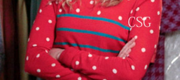 Carrie’s Red Polka Dot and Stripe Sweater and denim button front skirt on The Carrie Diaries